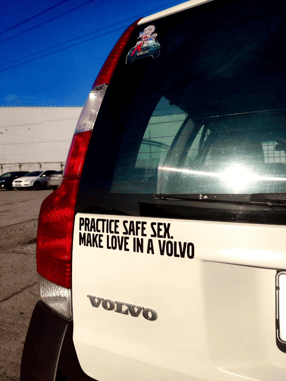 Наклейка practice safe sex. Make love in a Volvo изготовлена с помощью плоттерной резки.